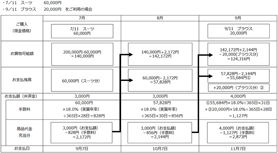 | | | ●ショッピングでのリボお支払いの一例 ご利用可能枠20万円・長期コース(実質年率18.0%、年365日の場合)でご利用の場合 |