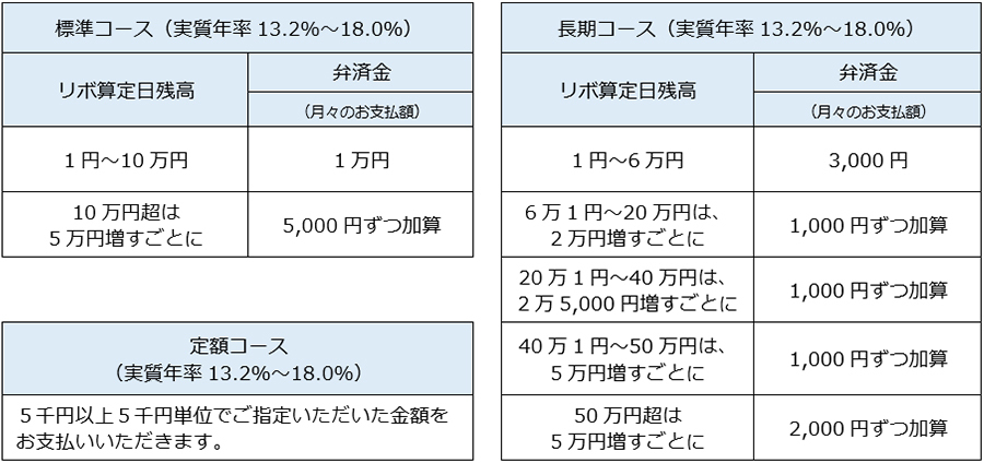 | リボルビング方式 | − | 利用算定日における利用締切日が到来したリボルビング払いの商品購入等代金の残高(以下「リボ算定日残高」という)を基礎として本人会員があらかじめ選択した、下表「月々の支払額算出表」記載の、標準コースもしくは長期コースに定める金額または本人会員が定額コースを選択のうえ5千円単位であらかじめ指定した金額(以下「弁済金」という)をお支払いいただく方法です。弁済金には、各コースともに当社所定の手数料を含みます。手数料の実質年率は、カード送付時の書面にてお知らせします。また、手数料は毎月のリボ算定日残高に対し当月8日から翌月7日までの日割計算とします。ただし、初回手数料は、利用締切日の翌日から翌月7日までの期間を日割計算します。なお、当社所定の方法によりお支払日前の支払いも可能です。この場合の手数料は、利用締切日の翌日または前回お支払いされた日の翌日からの日割計算によります。また、定額コースを選択の場合で、月々のリボ手数料が本人会員の指定した金額を超えるときは、当月のリボ手数料を超えるまで、当該指定金額に1万円単位で加算した金額が当月のお支払額となります。 |