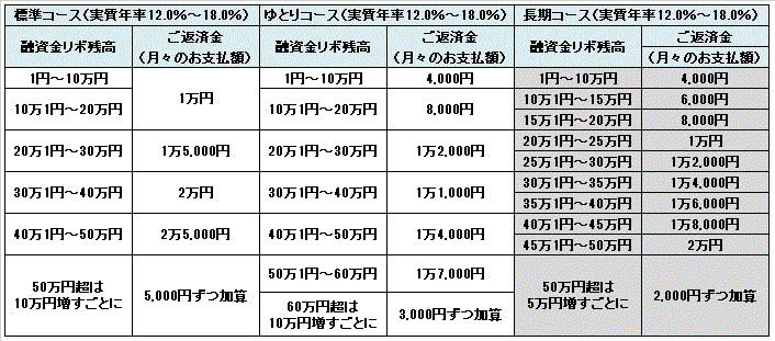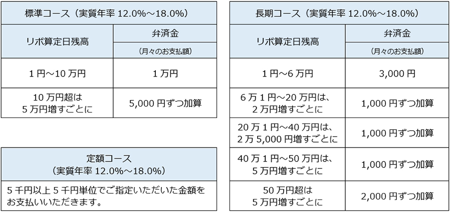 | リボルビング方式 | − | 利用算定日における利用締切日が到来したリボルビング払いの商品購入等代金の残高(以下「リボ算定日残高」という)を基礎として本人会員があらかじめ選択した、下表「月々の支払額算出表」記載の、標準コースもしくは長期コースに定める金額または本人会員が定額コースを選択のうえ5千円単位であらかじめ指定した金額(以下「弁済金」という)をお支払いいただく方法です。弁済金には、各コースともに当社所定の手数料を含みます。手数料の実質年率は、カード送付時の書面にてお知らせします。また、手数料は毎月のリボ算定日残高に対し当月8日から翌月7日までの日割計算とします。ただし、初回手数料は、利用締切日の翌日から翌月7日までの期間を日割計算します。なお、当社所定の方法によりお支払日前の支払いも可能です。この場合の手数料は、利用締切日の翌日または前回お支払いされた日の翌日からの日割計算によります。また、定額コースを選択の場合で、月々のリボ手数料が本人会員の指定した金額を超えるときは、当月のリボ手数料を超えるまで、当該指定金額に1万円単位で加算した金額が当月のお支払額となります。 |